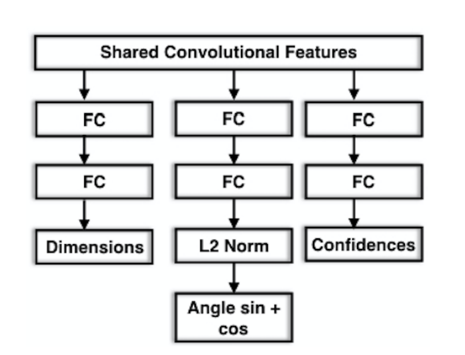In the proposed approach, a MultiBin architecture for orientation estimation is used. The orientation angle is discretized divided into \(n\) overlapping bins. For each bin, the Neural Network estimates the probability \(c_i\) that the output angle lies inside the \(i\)th bin and the residual rotation correction that needs to be applied to the orientation of the center ray of that bin in order to obtain the output angle. The figure below shows the architecture of the convolutional neural network. It consists of three branches.